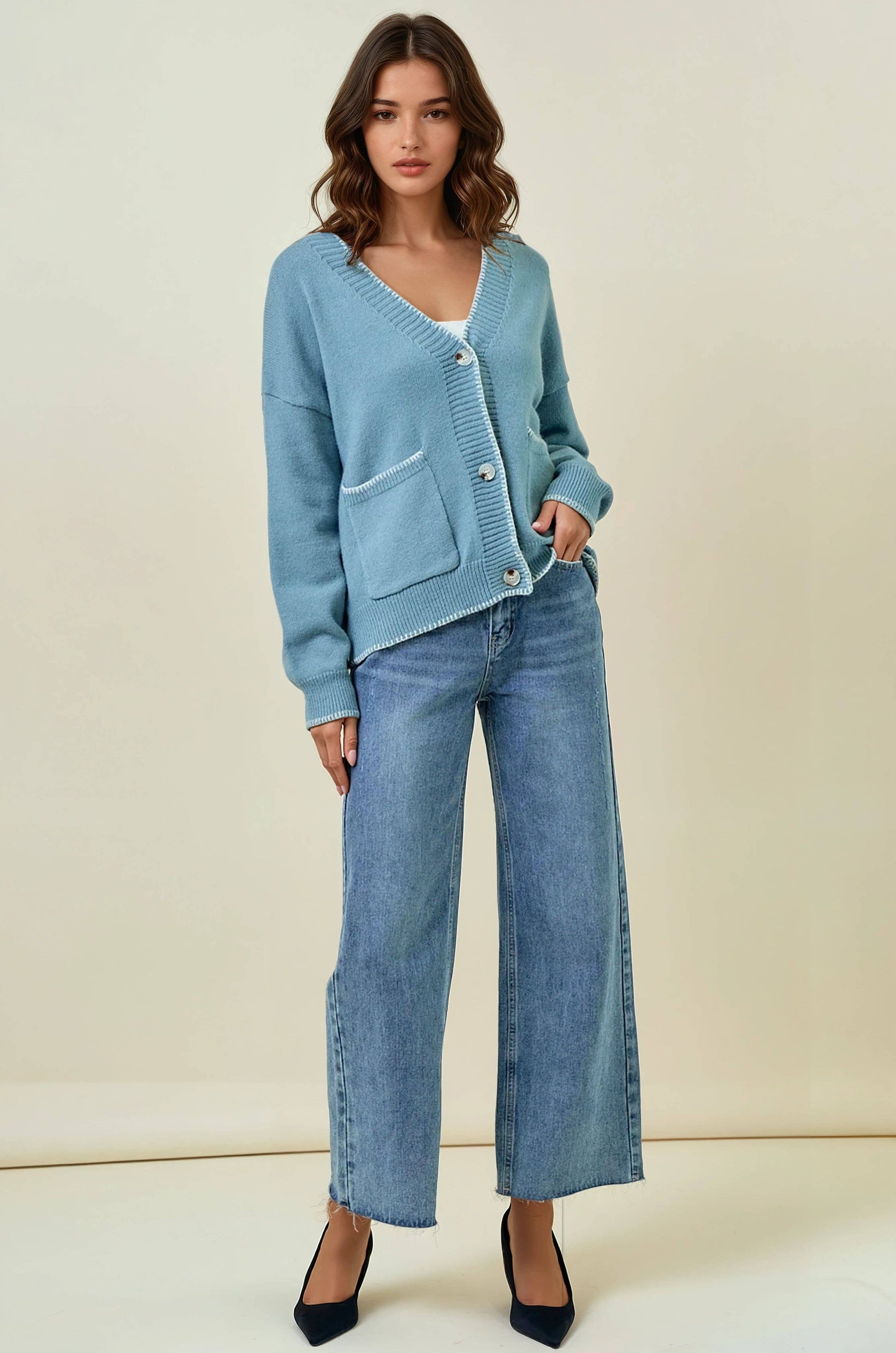CONTRAST BLANKET STITCH SWEATER CARDIGAN in baby blue color - Features bold contrast blanket stitching along the edges for a unique, handcrafted touch - Front button closure with large, easy-to-fasten buttons - Two functional front patch pockets - Ribbed cuffs and hem for added structure and comfort