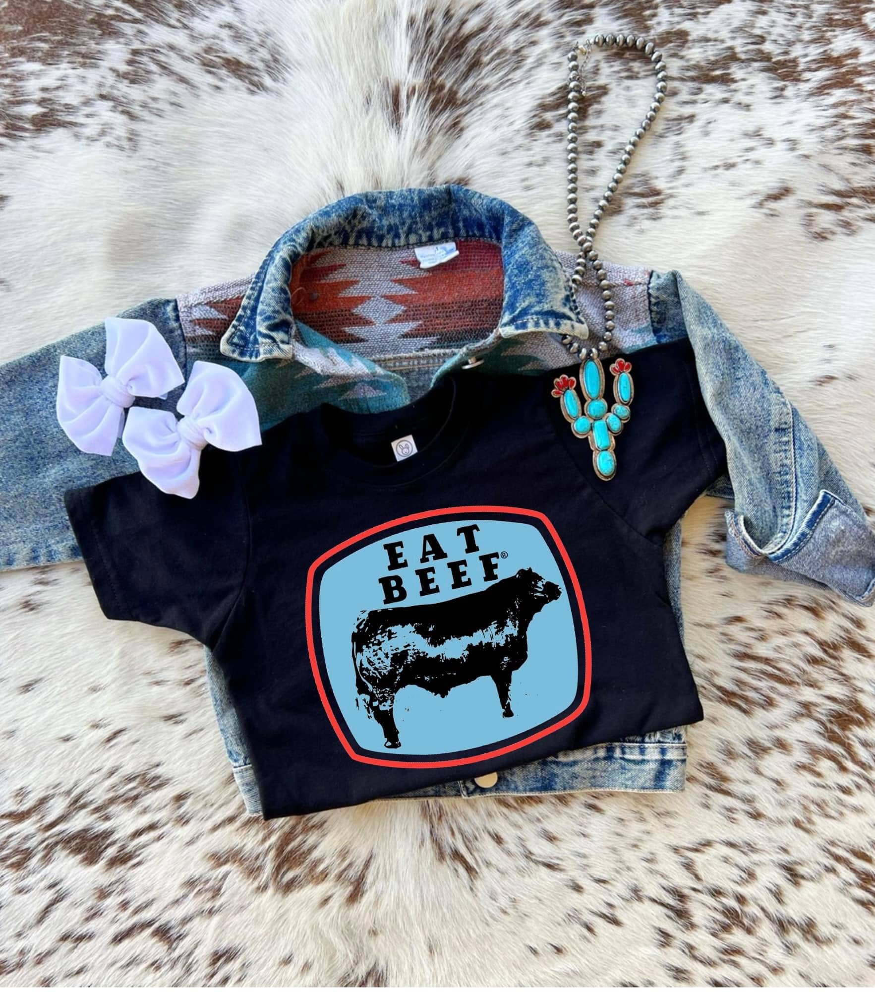 "Eat Beef" kids graphic tee. Printed on rabbit skins brand for sizes 6month -5/6t and gildan on sizes yxs-yl