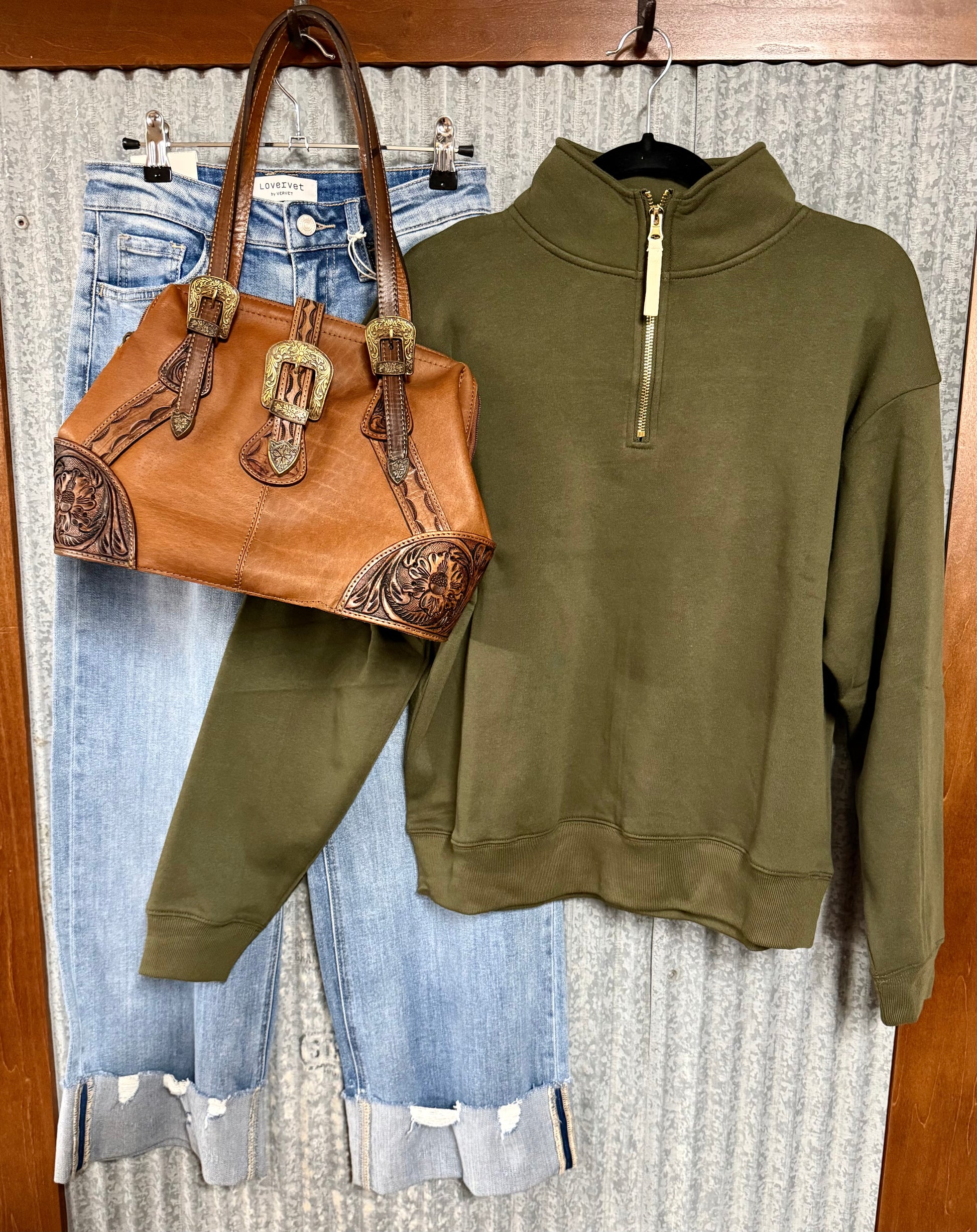 FLEECE HALF ZIP SWEATSHIRT in OLIVE COLOR.