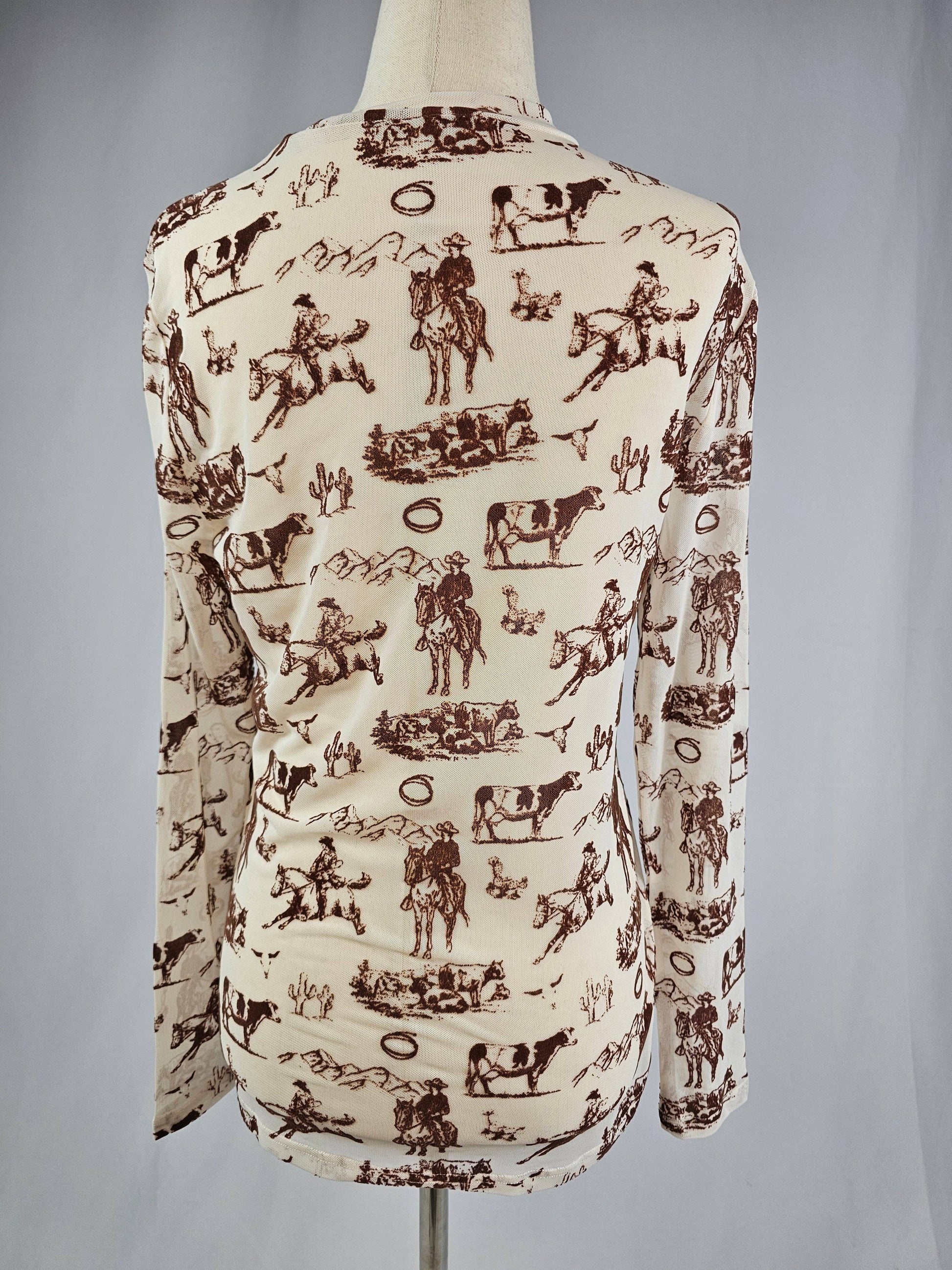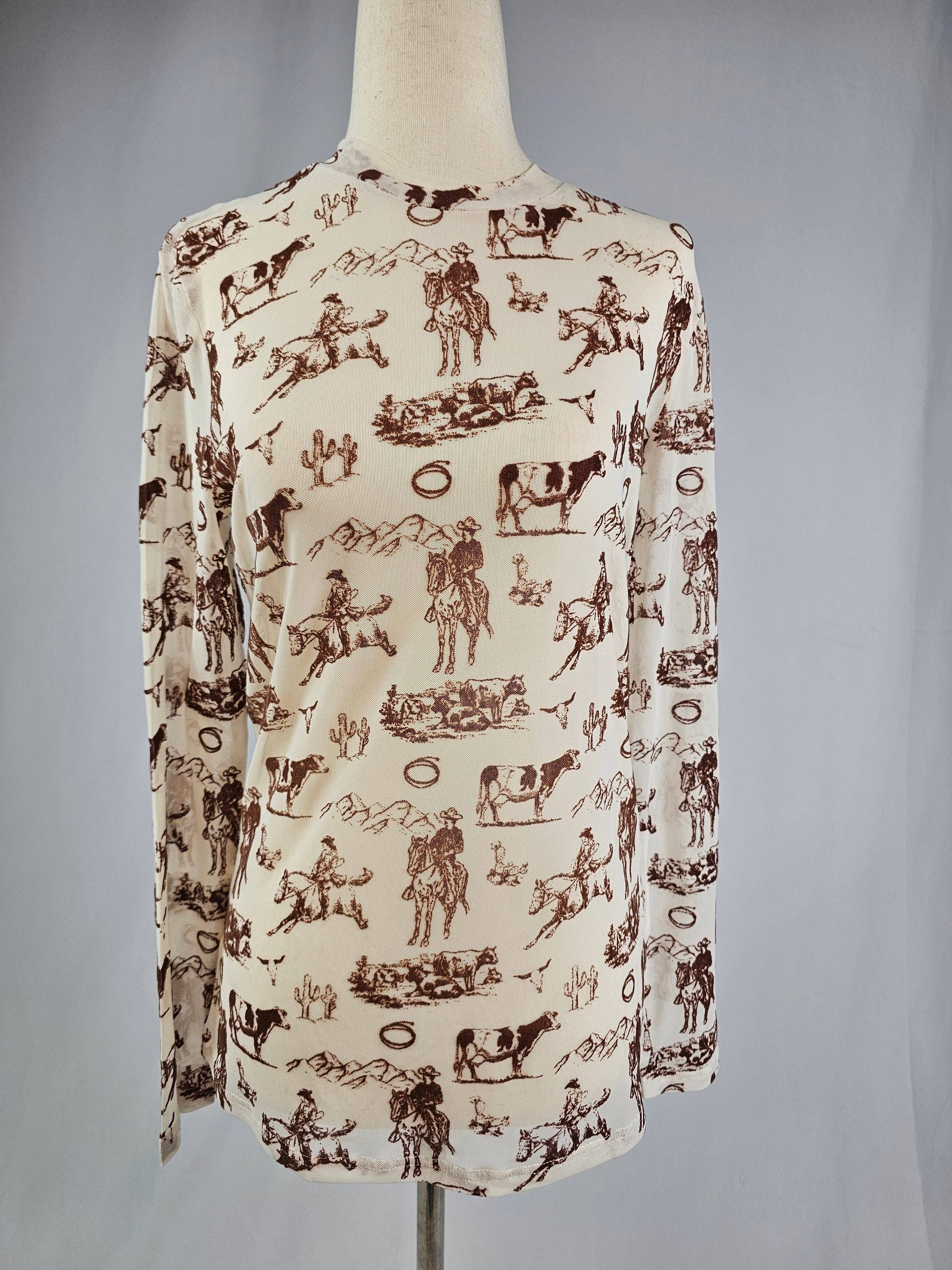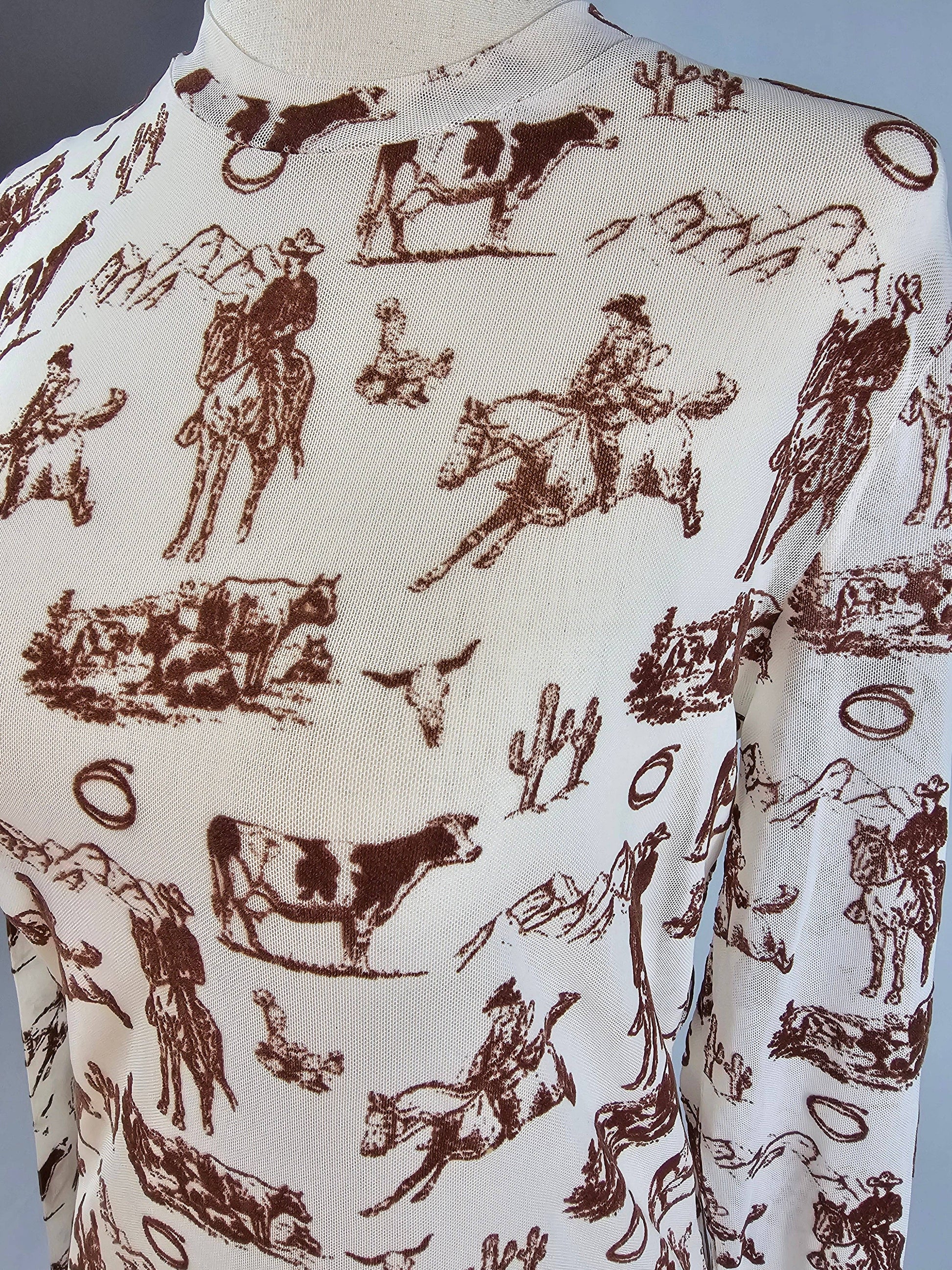 cream-and-brown velvet mesh long sleeve covered in rodeo-inspired prints. Cowboys, cattle, and desert scenes bring instant western flair, while the lightweight sheer fabric makes it easy to layer over a bralette or tank. Pair it with denim for a casual day look or dress it up for a night out—either way, this top is ready to ride.