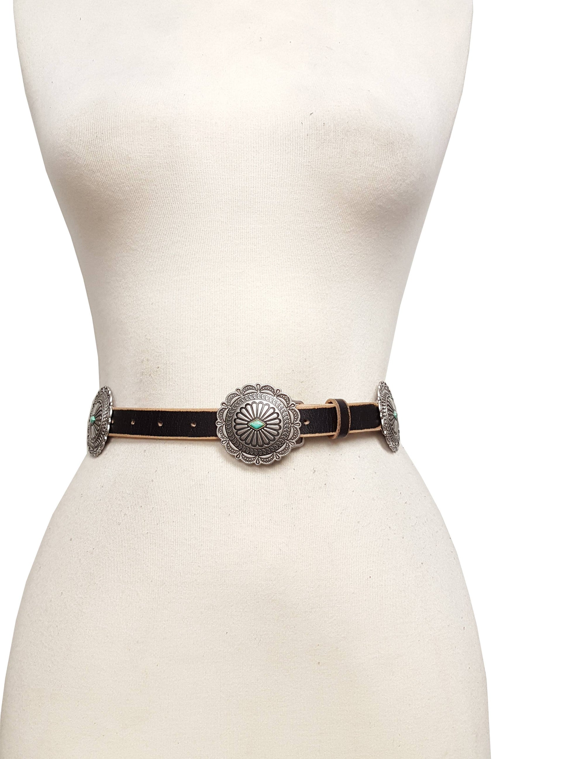 5 sliding conchos w. stones on the strap plus a matching buckle, total 6 parts per belt concho is about 2" in diameter Made with 100% Genuine Vintage Hand-Distressed Vintage Leather